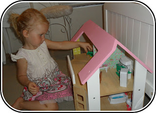 I nailed a peice of MDF {wooden sheet} to the bottom at the back to make 2 closed in rooms and 'wallpapered' some of the inside walls with scrap booking paper from Smudge and Sparkle Scrapbook Shop here in Ellenbrook, WA.