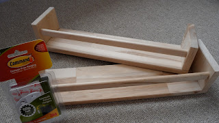 I used two spice racks from Ikea. {$6.95 ea} and I choose to use Command hooks to fix to the wall.