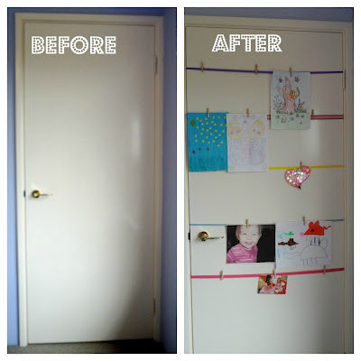 I then added a hook just incase the art work becomes to heavy and pulls the ribbon down. {I just did one in the middle, but if you are planning on hanging heavier things I would suggest you do two near the edges of the door rather than one in the middle}